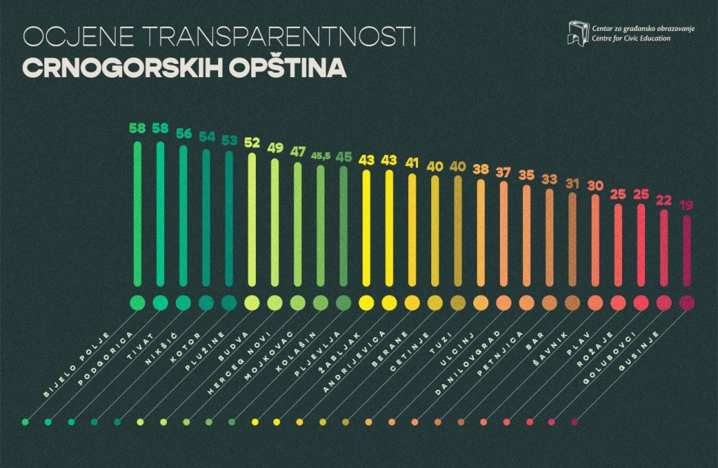 Od ukupno mogućih 100 poena, po indikatorima sprovedenog istraživanja, prosječna ocjena transparentnosti crnogorskih opština za 2019.godinu je 40.76 poena. Dvije najtransparentnije opštine – Podgorica i Bijelo Polje – imaju nešto malo manje od tri petine mogućih poena, odnosno 58 poena, a za njima slijede i opštine Tivat, Nikšić, Kotor i Plužine, dok je najlošije ocijenjena opština Gusinje sa 19 poena. Zanimljivo je ukazati da nema razlika u transparentnosti opština u kojima vlast drži vladajuća koalicija na državnom nivou i onih opštine u kojima su na vlasti partije koje su na državnom nivou opozicija. Tako je prosjek za opštine koje vodi opozicija 40.80, odnosno 40.78 poena za one u kojima je na vlasti vladajuća koalicija sa državnog nivoa. Ovo opominje da pitanje transparentnosti ostaje nisko kotirano kod razlitičih a bitnih političkih aktera, uprkos njihovim deklarativnim zalaganjima.